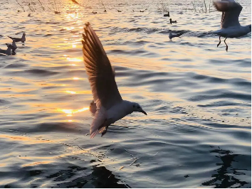 通过相机捕捉鸟的动态,日落衬托湖面,波光粼粼,成为这个季节最好的诠释。