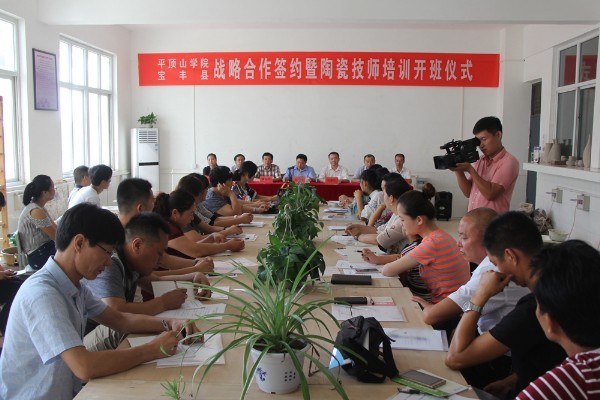 8月21日上午,由十大体育网站承办的宝丰县首届陶瓷企业技师培训班开班典礼在艺术楼陶瓷教室举行。公司党委副书记田建伟,宝丰县政府党组成员、副县级干部郜现营,宝丰县汝窑瓷业保护发展局的负责同志,公司十大体育网站负责人、部分教工和来自宝丰县汝瓷行业的30多名技工参加了开班仪式。开班仪式由地方合作处处长杨宏亮主持。