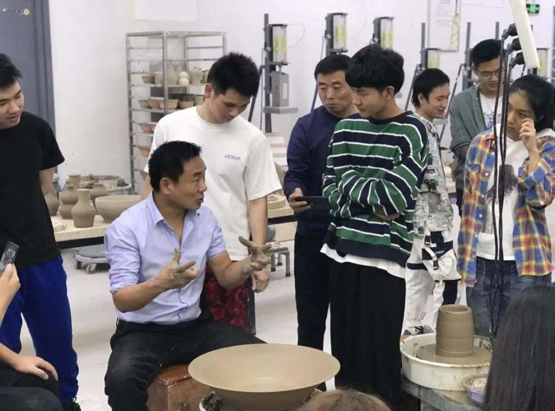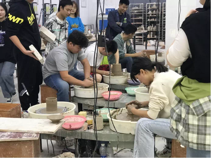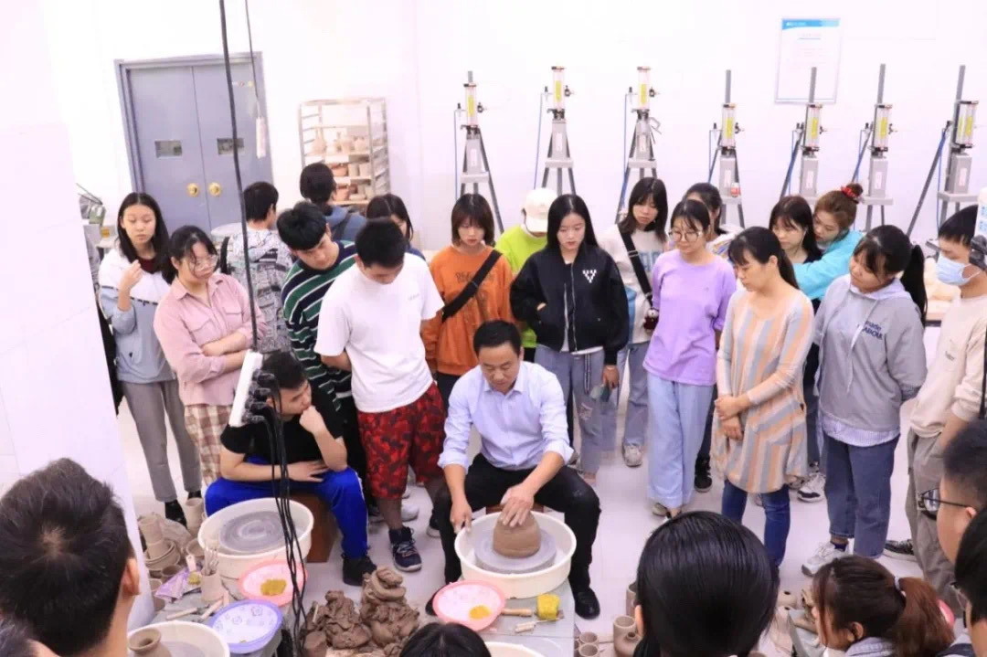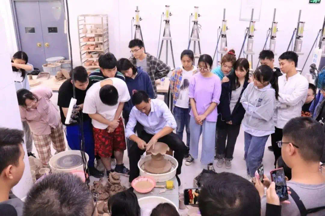 王老师向同学们讲解不同器型的拉坯技巧,同学们听得聚精会神。