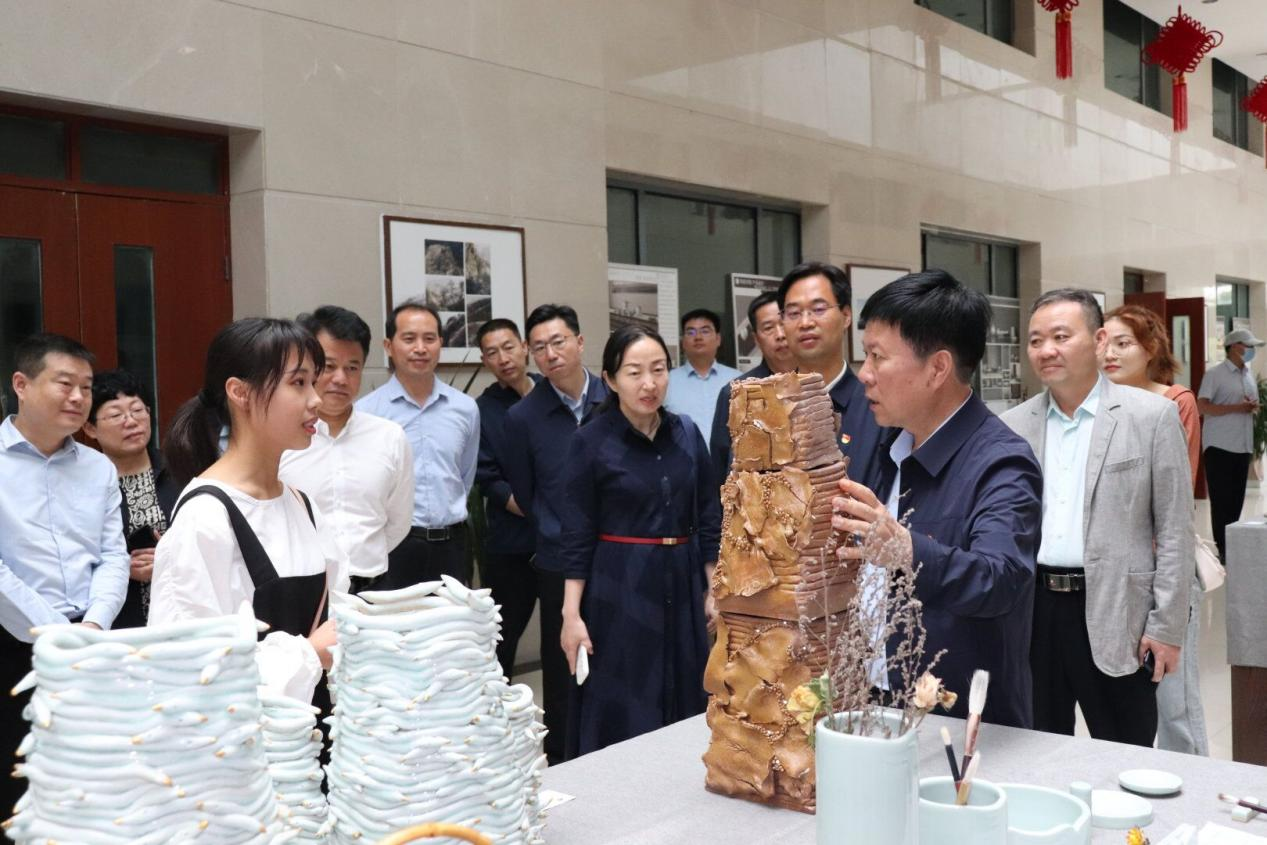 在参观过程中,周斌认真倾听不同作者对自己作品创作过程的讲解,还不时询问他们在创作过程中的细节,了解各类作品的创作背景、文化内涵、市场前景,对员工和指导老师的辛勤创作给予了很高的评价,连连称好!周斌指出,陶瓷及艺术设计类专业要坚持产教融合,以本地文化传统为出发点继承和发扬传统文化,做到立足于本地,与时代同步,将教学过程与产品生产和销售对接,打开文创作品的销路。他还现场要求相关政府管理部门要主动作为,积极为公司推广文创作品提供便利,将师生艺术创意作品引入各旅游景点,提升本地旅游景点的文化内涵和品味,同时激发师生艺术创作的灵感和激情。