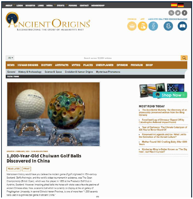 德国《起源网》报道:1,000-Year-Old Chuiwan Golf Balls Discovered In China(中国发现千年历史的高尔夫球)