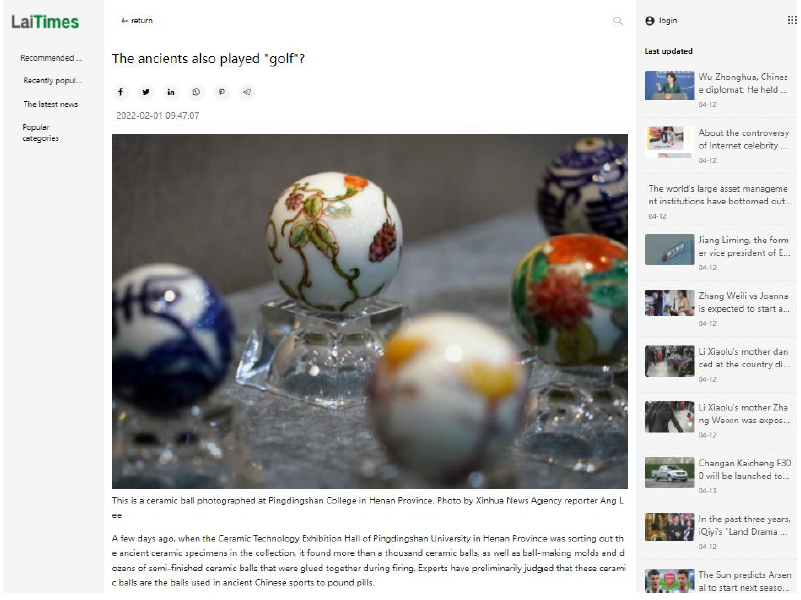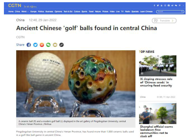 《中国环球电视网》报道:Ancient Chinese'golf'balls found in central China(中国中部发现古代中国“高尔夫球”)