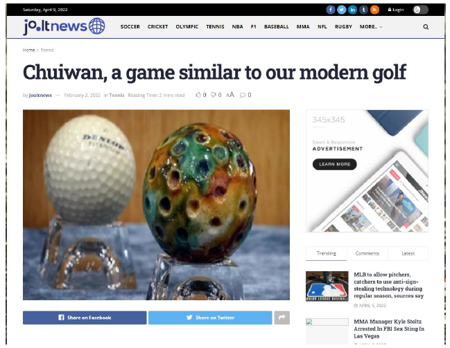 美国《JOLT新闻网》报道:Chuiwan,a game similar to our modern golf(捶丸:一项类似现代高尔夫球的运动)