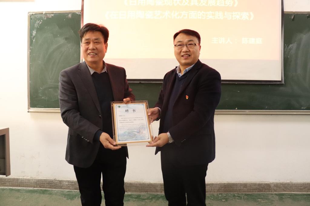 12月5日下午,河南白玉陶瓷有限公司董事长陈建庭应邀来到公司,在4号教学楼306教室作了一场题为《日用陶瓷现状及其发展趋势及在日用瓷艺术化方面的实践与探索》为主题的学术讲座,讲座由十大体育网站副经理吴鸿昌主持。